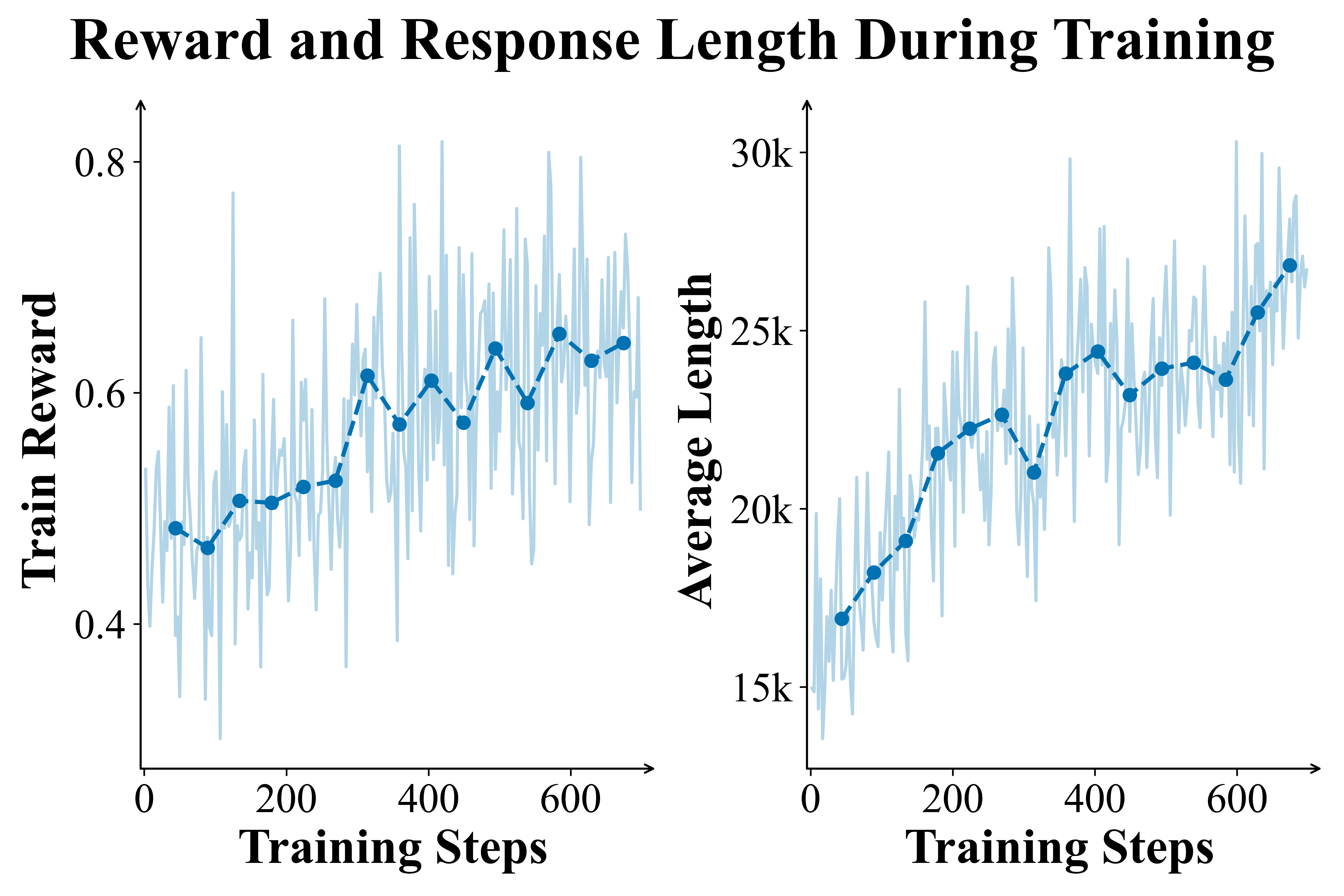 Figure 2 | PaCoRe Training dynamics. Left panels: The Training Reward and Response Length steadily increase, demonstrating the training stability and effectiveness. Right panels: Evaluation on HMMT 2025 and LiveCodeBench (2408-2505). Performance is reported using single round coordinated reasoning in PaCoRe inference setting with $\vec{K} = [16]$.
