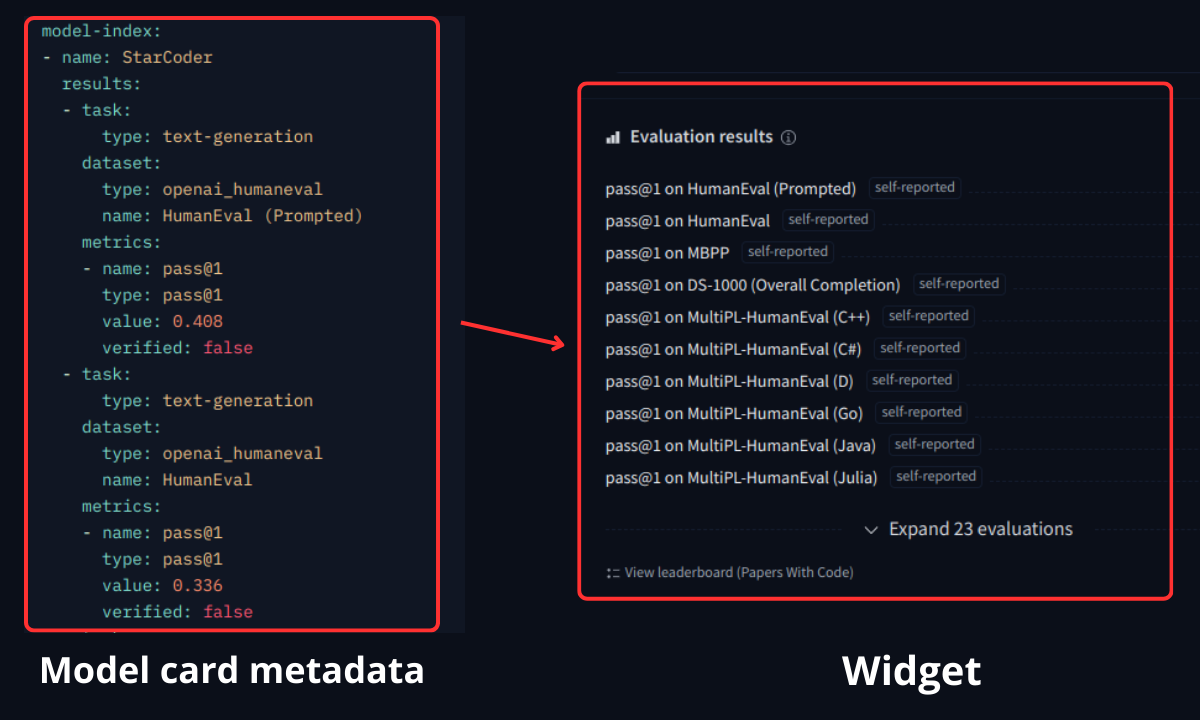 You can specify your model’s evaluation results in a structured way in the model card metadata. Results are parsed by the Hub and displayed in a widget on the model page. Here is an example on how it looks like for the bigcode/starcoder model: