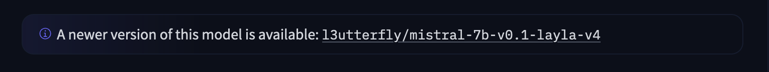 new_version: l3utterfly/mistral-7b-v0.1-layla-v4This metadata will be used to display a link to the latest version of a model on the model page. If the model linked in new_version also has a new_version field, the very latest version will always be displayed.