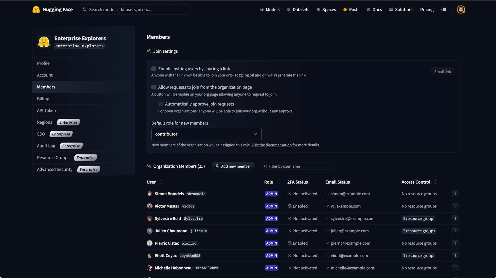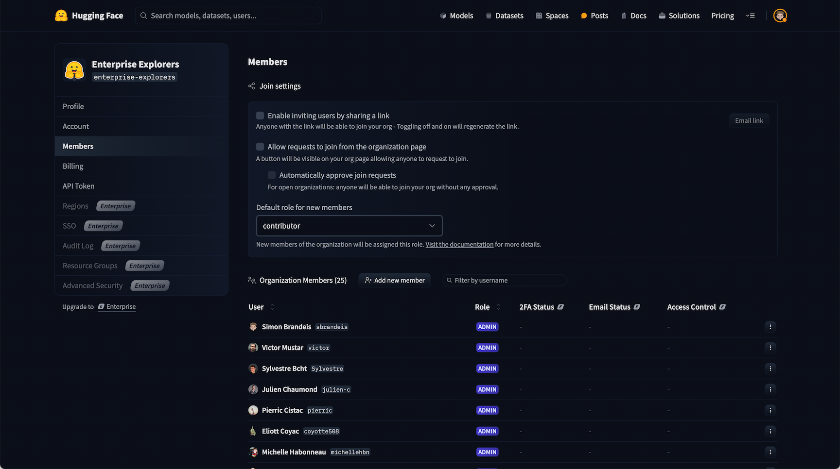 read: read-only access to the Organizationās repos and metadata/settings (eg, the Organizationās profile, members list, API token, etc).contributor: additional write rights to the subset of the Organizationās repos that were created by the user. I.e., users can create repos and then modify only those repos. This is similar to thewriterole, but scoped to repos created by the user.write: write rights to all the Organizationās repos. Users can create, delete, or rename any repo in the Organization namespace. A user can also edit and delete files from the browser editor and push content withgit.admin: in addition to write rights on repos, admin members can update the Organizationās profile, refresh the Organizationās API token, and manage Organization members.