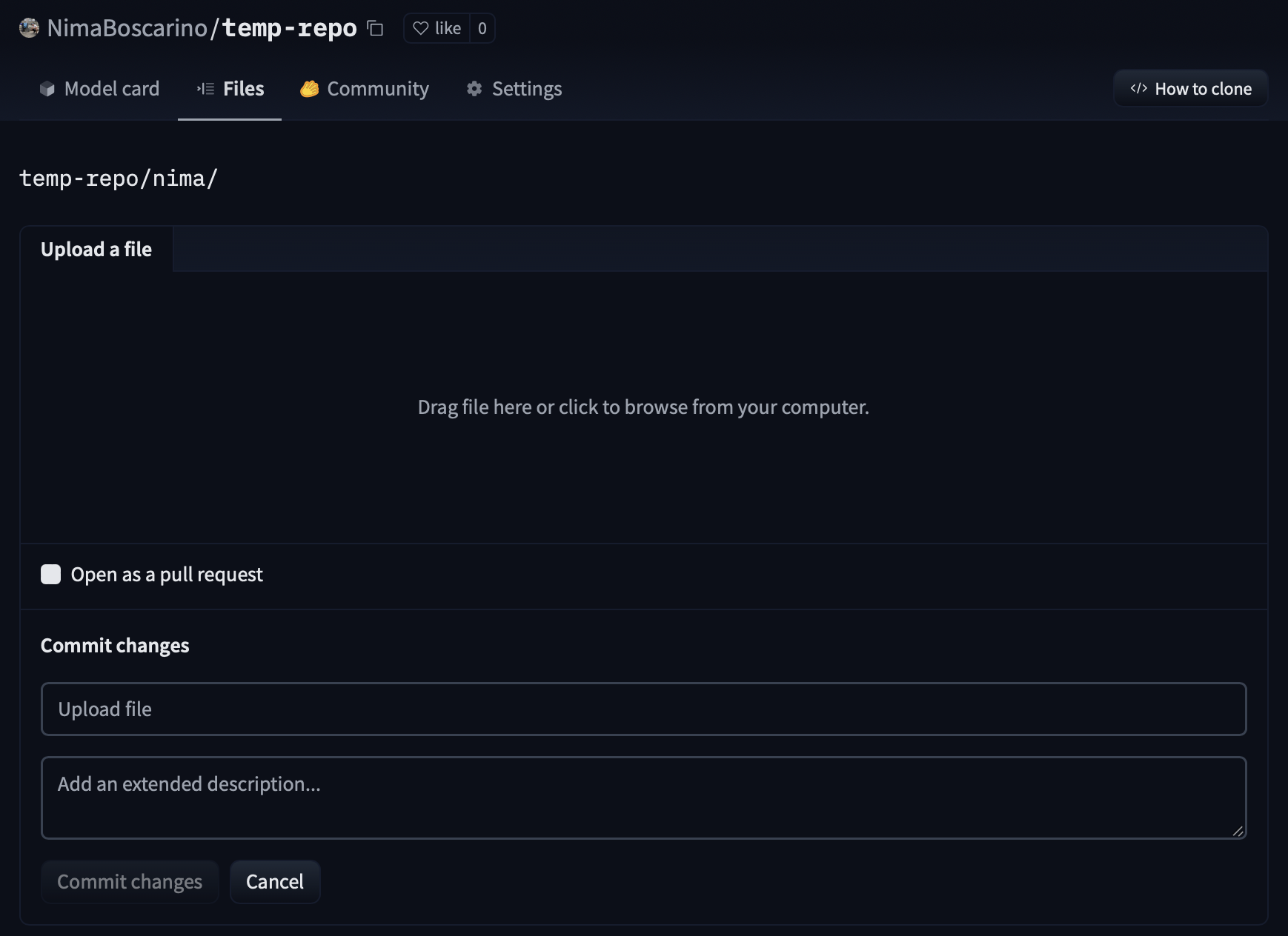 Every time you go through the add-commit-push cycle, the repo will keep track of every change you’ve made to your files. The UI allows you to explore the model files and commits and to see the difference (also known as diff) introduced by each commit. To see the history, you can click on the History: X commits link.
