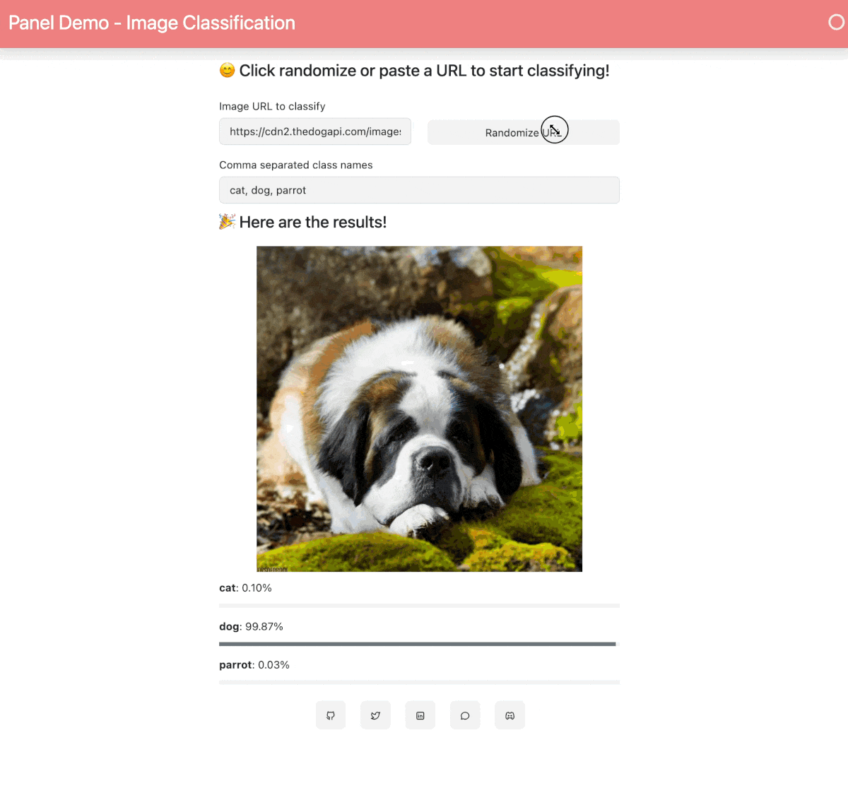 When your Space is built and ready, you will see this image classification Panel app which will let you fetch a random image and run the OpenAI CLIP classifier model on it. Check out our blog post for a walkthrough of this app.