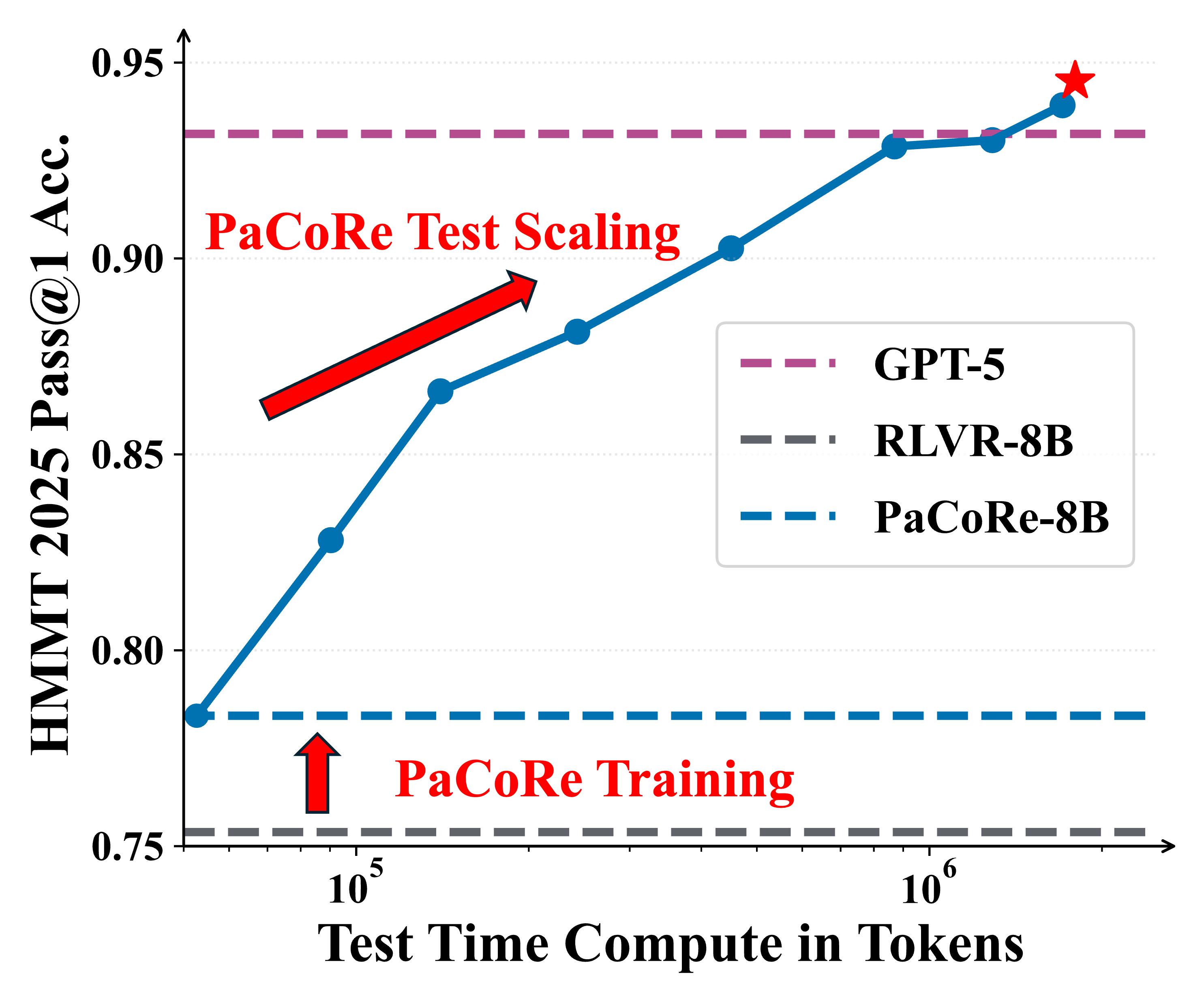 | PaCoRe-8B (medium) | 92.9 (869k) | 76.7 (659k) | 14.6 (694k) | 45.7 (45k) |