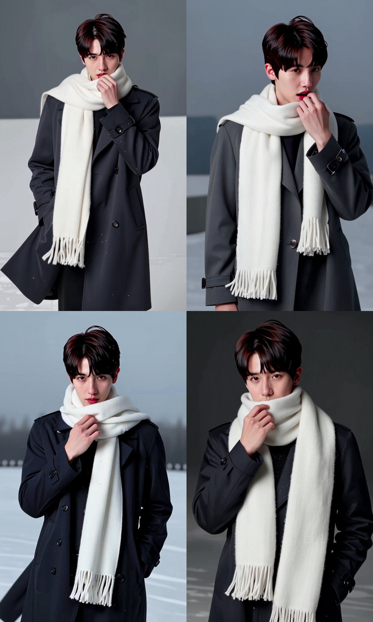 白围巾垂落至腰际,雪色绒毛在冷光中泛着柔光。他微微侧头凝视镜头,睫毛在面颊投下细碎阴影,